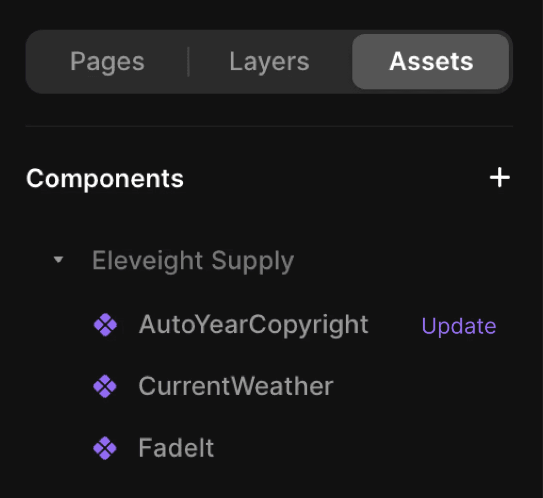 The component is also available at all times in the left side panel, under Assets tab - Eleveight Supply.