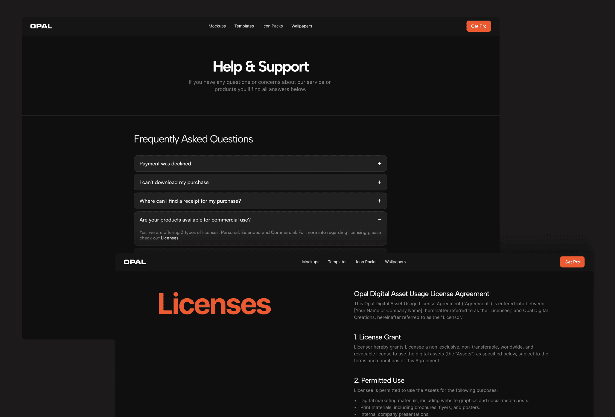 Offering both dark & white versions which automatically switches, this template offers to your visitors a professional and easy to navigate interface but also a well thought user experience. Set-up your product images, product category, different pricing based on license type or just free products, all easily adjustable from the CMS panel.